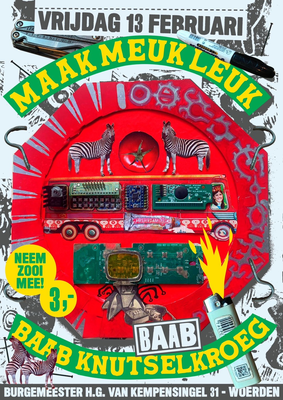 Maak meuk leuk en zooi mooi! Kom vrijdag 13 februari om 20.00 naar baab, we gaan gekke dingen maken van spullen die je anders weg zou gooien, gewoon omdat dat leuk is. Hjordis weet hier alles van en komt langs om een workshop te geven! Neem ook zelf zooi mee, wij zorgen ook voor zooi en spullen om het mee te monteren, knippen, breken, smelten of plakken. Dit alles onder het genot van een drankje, muziek en gezelligheid zoals altijd. Entree is 3 euro en je krijgt er een welkomsdrankje voor terug. Tot dan!!!